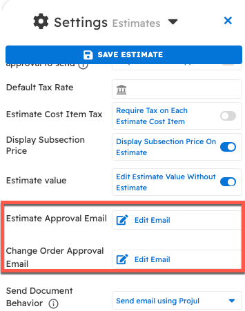 Scroll down to the "Estimate Approval Email" and "Change Order Approval Email" fields.