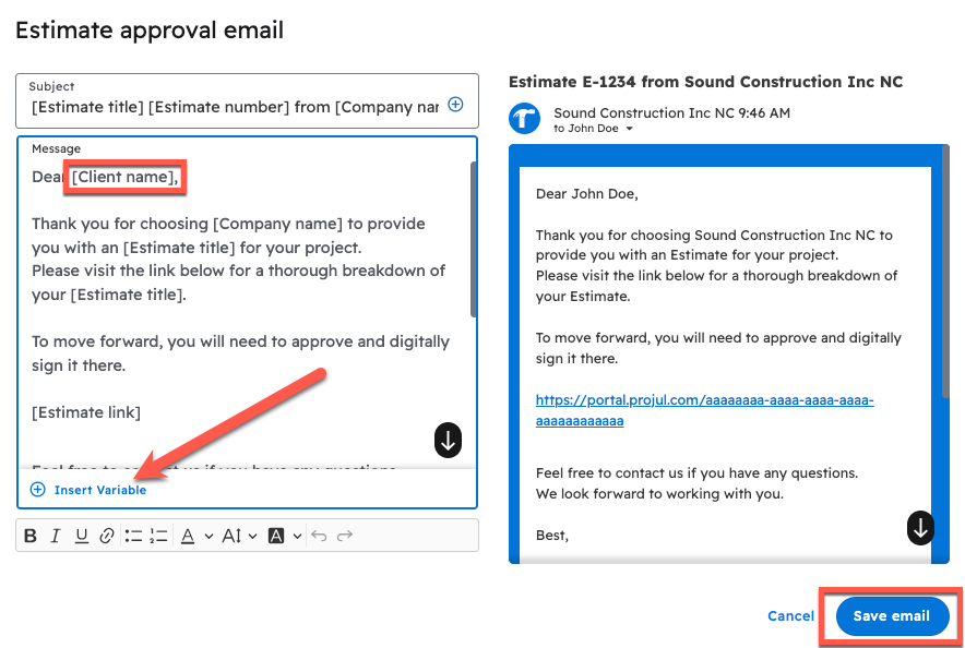 When editing the email, "Variables" can be added, which are automatically replaced with the relevant customer, estimate or company info related to this estimate/project.