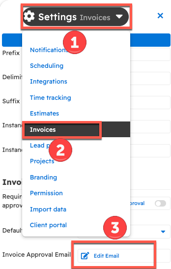 The same modifications can be made by navigating to the Invoices settings from the tab at the top of the Sidebar menu and scrolling down to the "Invoice Approval Email" field.