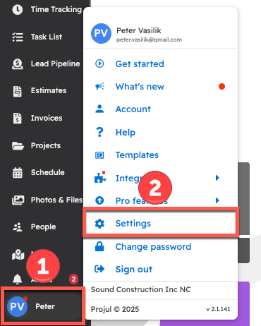 Navigate to the settings menu by clicking on the initials in the bottom left corner of the Projul app and opening Settings from the general menu.