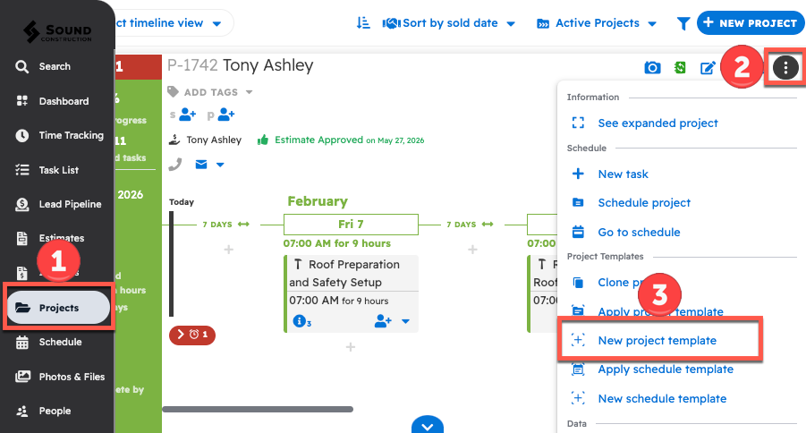 In order to create a template from an existing Project, start by navigating to the projects page and finding the project you would like to copy the tasks of. Open the three dot menu button in the top right corner of the projects card and select "Make Template From Project."