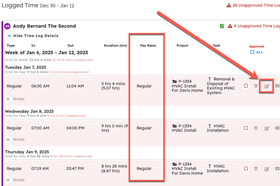 When viewing time logs, you can see which pay rate was used for each logged time entry. You can also edit the time log by clicking on the pencil edit icon on the right hand side.