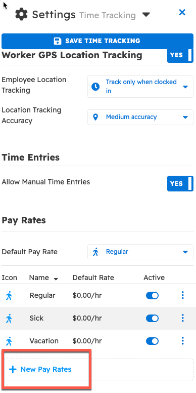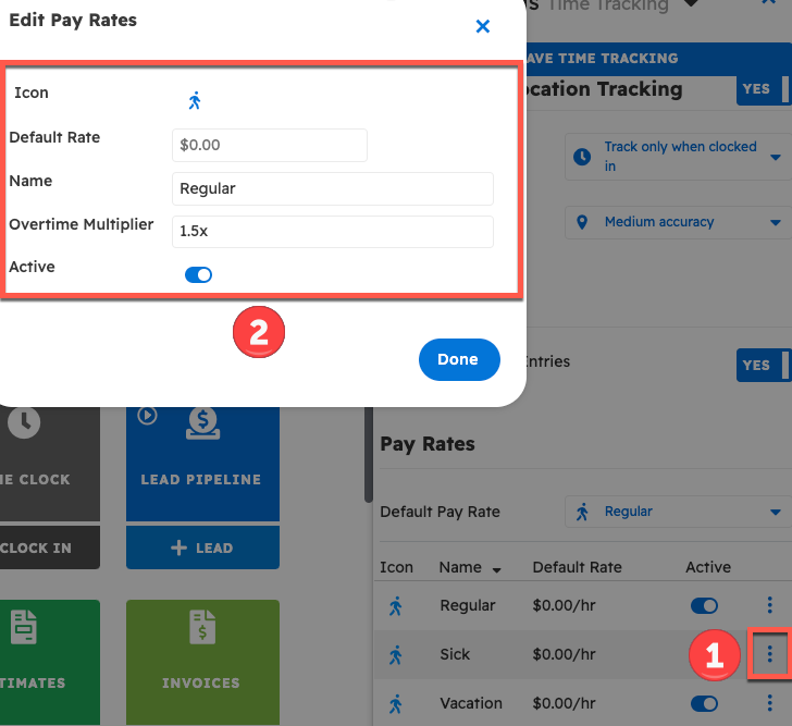 Once editing, you can change the icon, default rate, name, overtime multiplier (the change in rate if a time log ran into overtime), and whether the rate is active or not (meaning whether anyone in the company can access the pay rate and clock into it).
