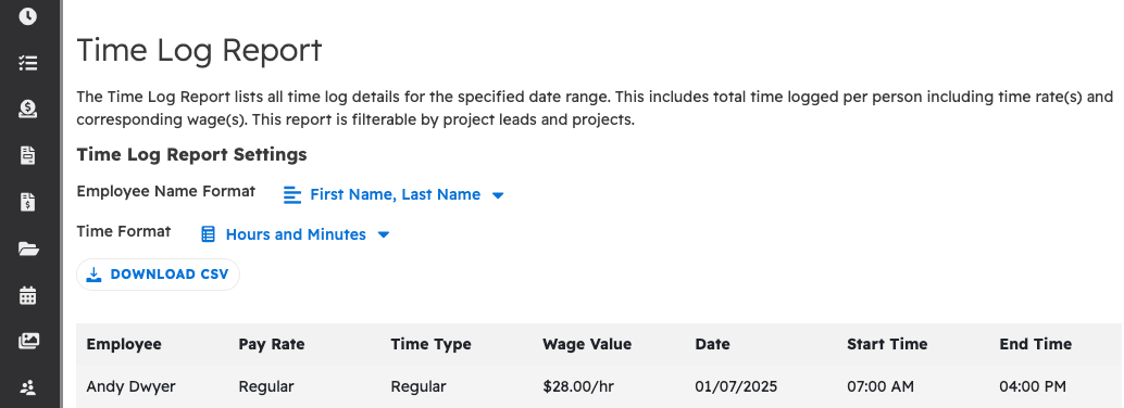 Within the Time Log Report, you can select a date window in the top right corner, along with filtering by Project or changing the sort. You can also download the report as a CSV file.