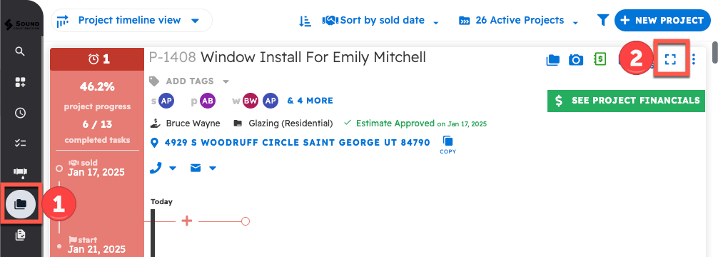 To view the project notes for a project, select the four-corner box on the project card. This will expand the project, allowing you to view additional information including the project notes. You can also access the notes by editing the project.
