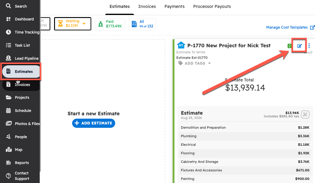 To save an estimate or a change order, open the desired document. This example will use an estimate.