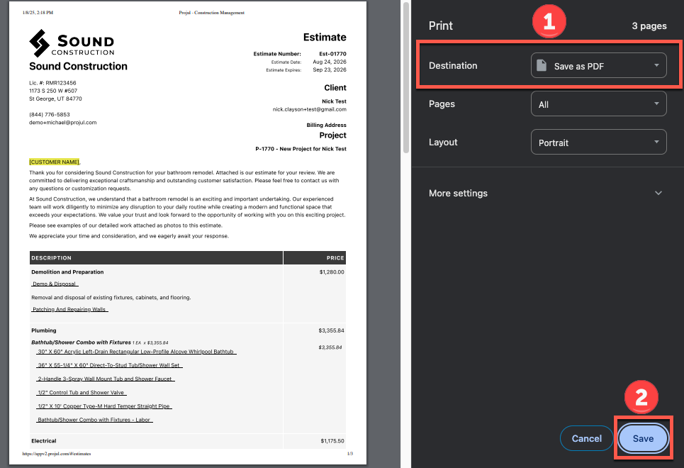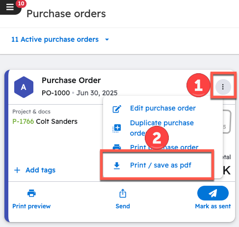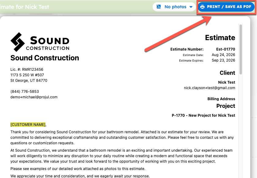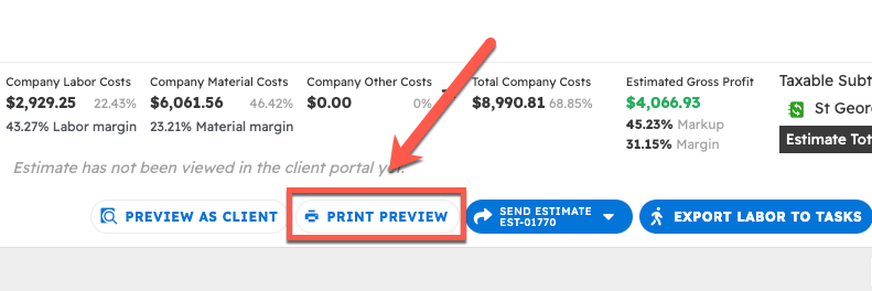 Estimates, Change Orders, Purchase Orders, and Invoices can be printed or saved as PDFs by opening them and selecting "Print Preview" on desktop.