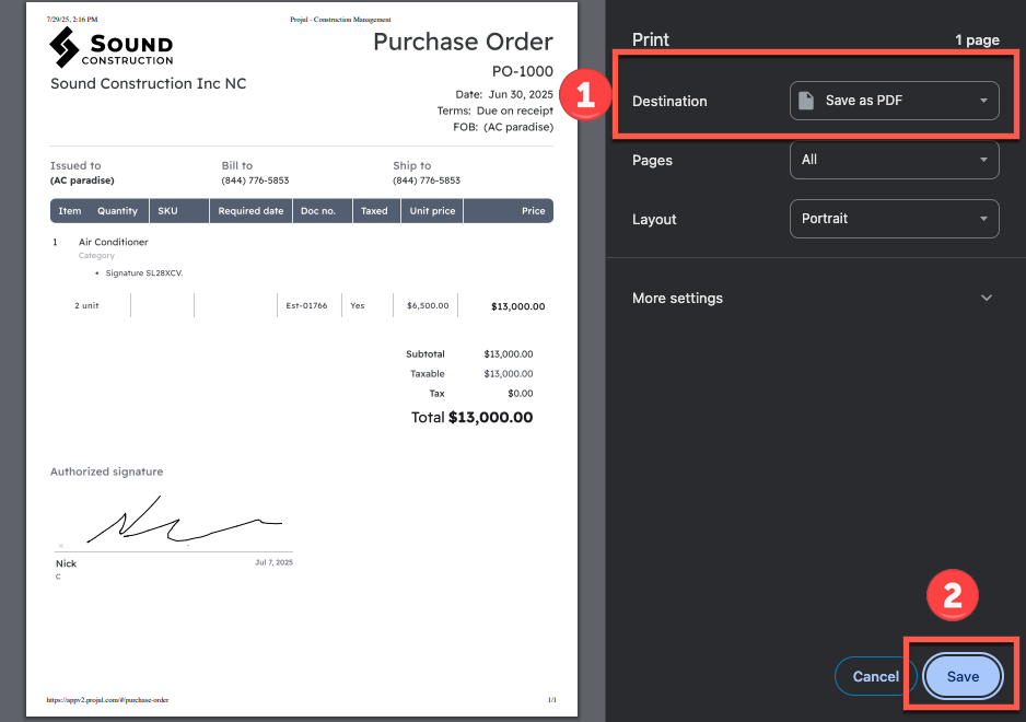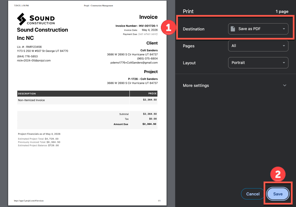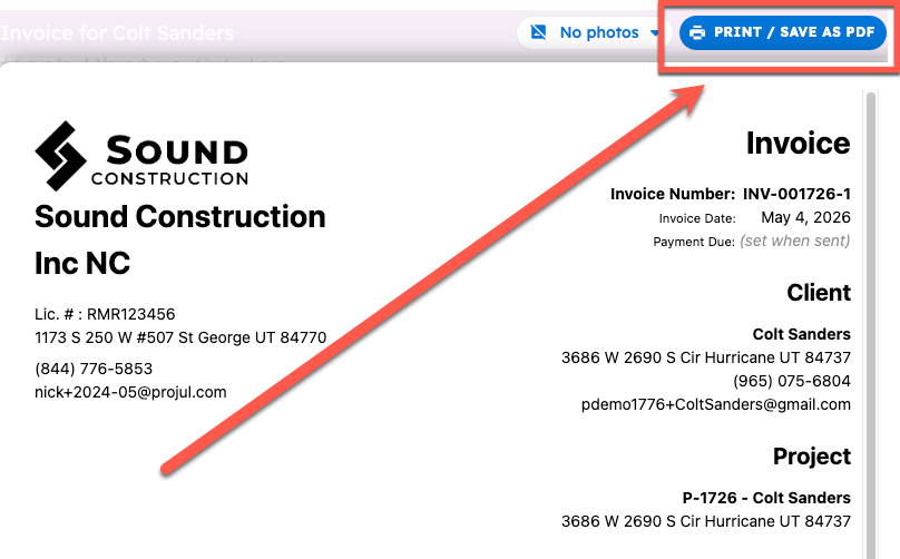 Using the same steps as with an Estimate or Change Order, the Invoice can be saved as a PDF.