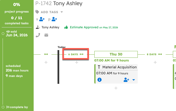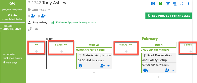 From the Project Timeline View on the Projects page, you can press one of the two-sided arrow icons to adjust all tasks after that point to either extend or reduce the time between the tasks.