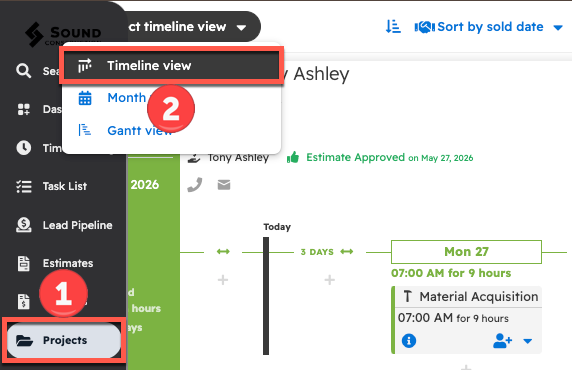 Start by opening the Projects page and selecting the "Project Timeline View." You can then find the project that you are trying to adjust the schedule of.