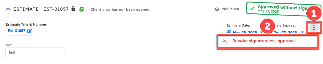 Open the 3-dot menu and select "Mark not approved by client." If your client has actually signed this Estimate, then the button will then be "Revoke signatureless approval."