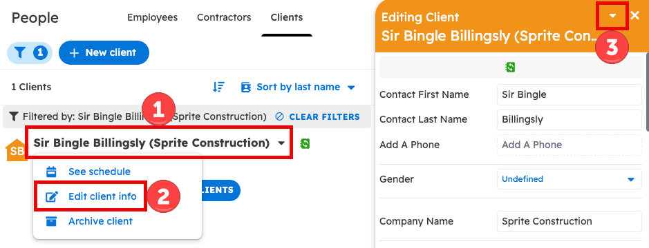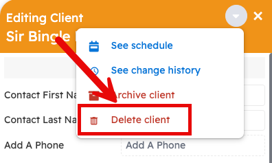 On the People page while viewing the clients, click on the name of the client you wish to delete, and press the arrow button in the upper right corner in the editor, and then select "Delete Client."