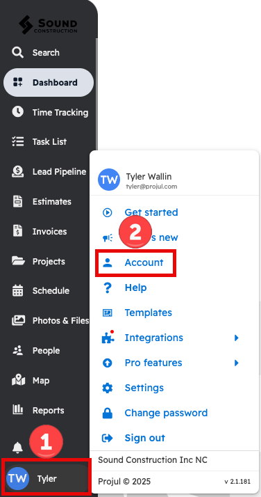 Start by pressing your initials in the lower left and selecting "Account."