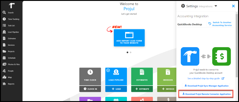 - Download the Projul Sync Manager Application on the same computer as QuickBooks Desktop. You can download the Projul Sync Manager from Projul (screenshot below) or by clicking here.