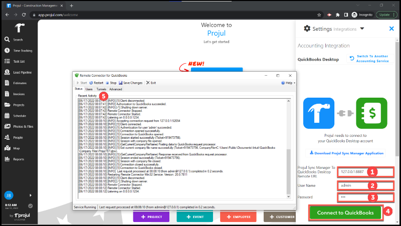 - Note: Both the Projul Sync Manager and Remote Connector can run in the background and do not need to have the popup open for the sync to run.