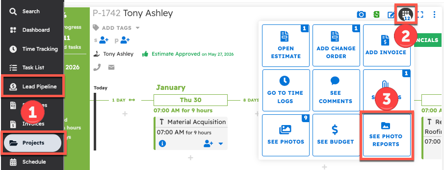 Projul's photo report can be accessible within the app via the 9-square "dial pad" icon found on the project file card. This dial pad can be found on the project file card on two pages within Projul: the lead pipeline and the projects page.