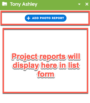 A sidebar will open, displaying all current photo reports in a list. Note that for this project, no photo reports have been created. To create a new photo report, select "Add Photo Report".