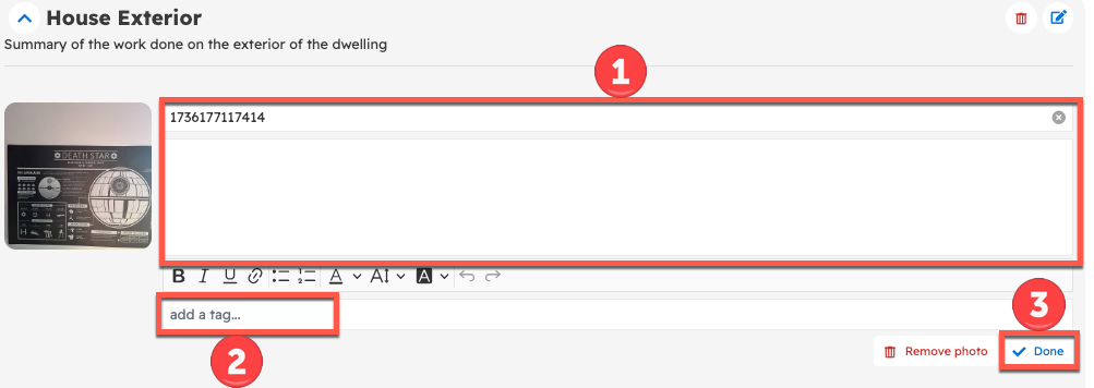 Similar to the section title and description, image names and descriptions (highlighted field 1) can be templated (highlighted field 2) for faster construction of future photo reports. Tags can also be added to photos (highlighted field 3). Once all desired changes and edits have been made, save these changes by selecting "Done" (highlighted field 4).