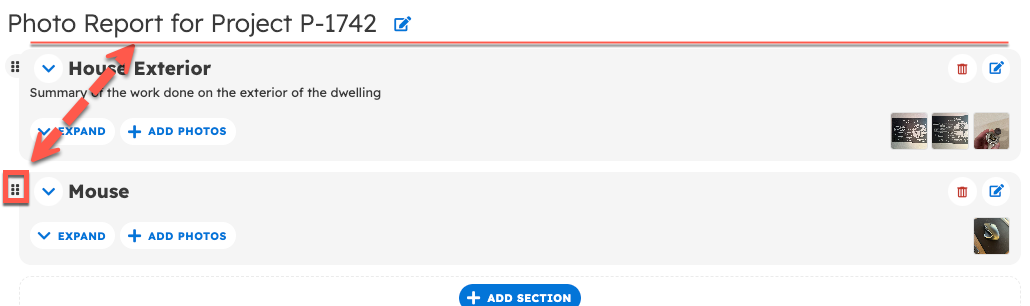 It is easy to move around sections or photos beneath expanded sections to customize the format of this report. Simply click and hold the 6-dot icon (highlighted area 1) on an item and drag it to its desired location. Note the horizontal blue line (highlighted area 2) indicating where the item will be moved to upon release of the mouse hold.